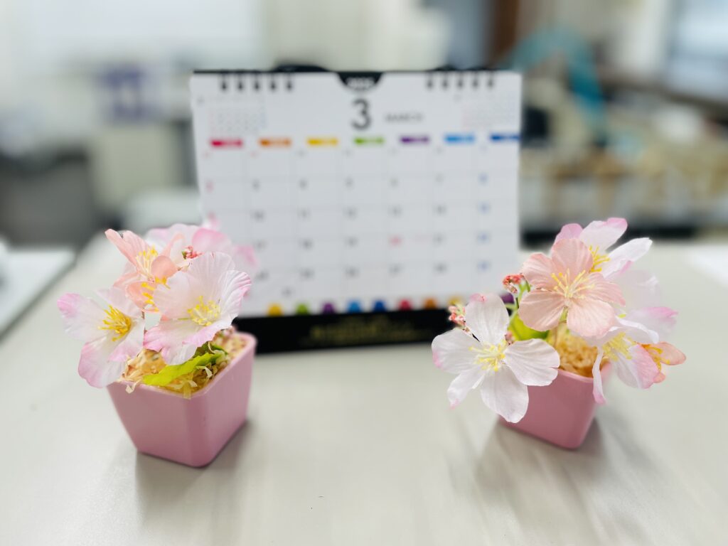 昨日、ひな祭りが終わりましたので、事務所玄関の飾りを桜🌸に変更しました😊👍