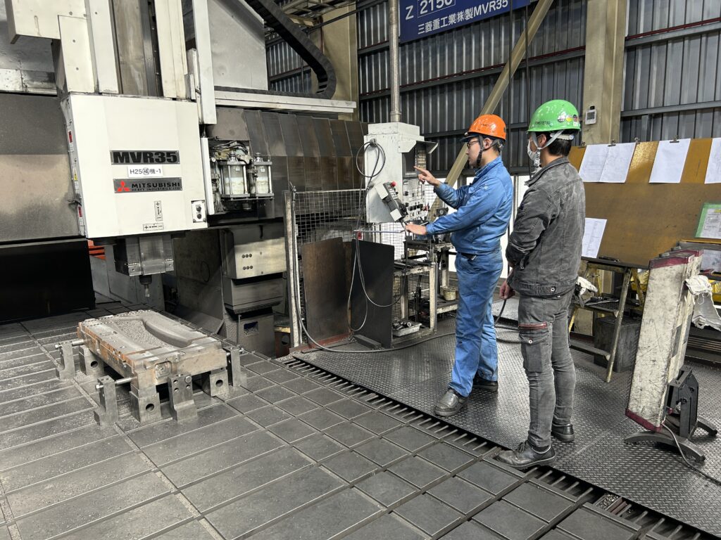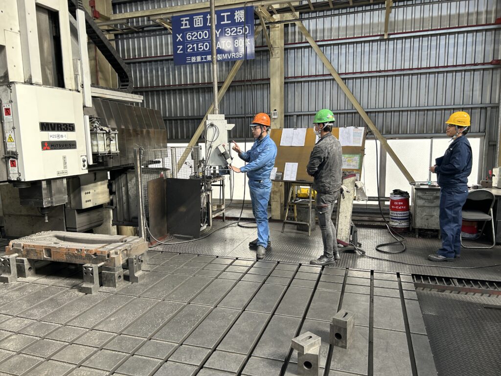 昨年の11月からグループ会社である友鉄工業㈱より、機械加工の勉強をしに来ている社員さんが、初めて大型五面加工機で加工に挑戦しました👏😊