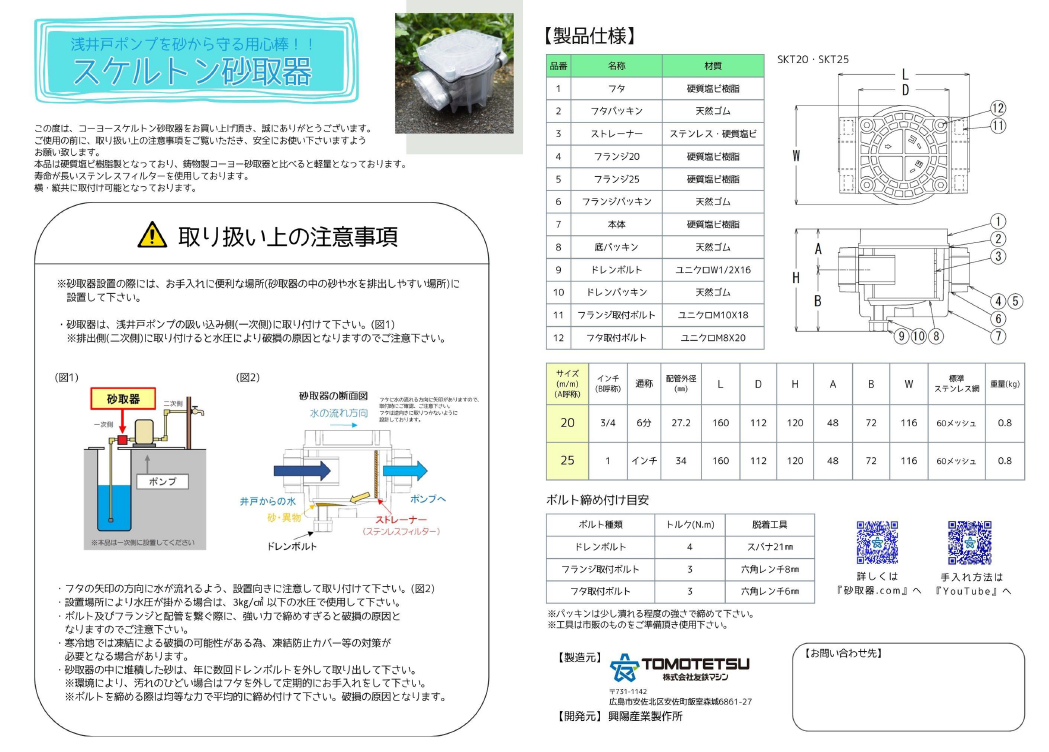従来品が重く、パイプへの負荷が心配との声を頂き、樹脂製にすることで軽量化を行った製品がスケルトン砂取器となります。取り付けも楽でパイプへの負荷も少ないです。従来品の鋳物製と同様に、こちらの製品も多くの注文を頂いております。上記パンフレットを参考にして頂ければと思います。